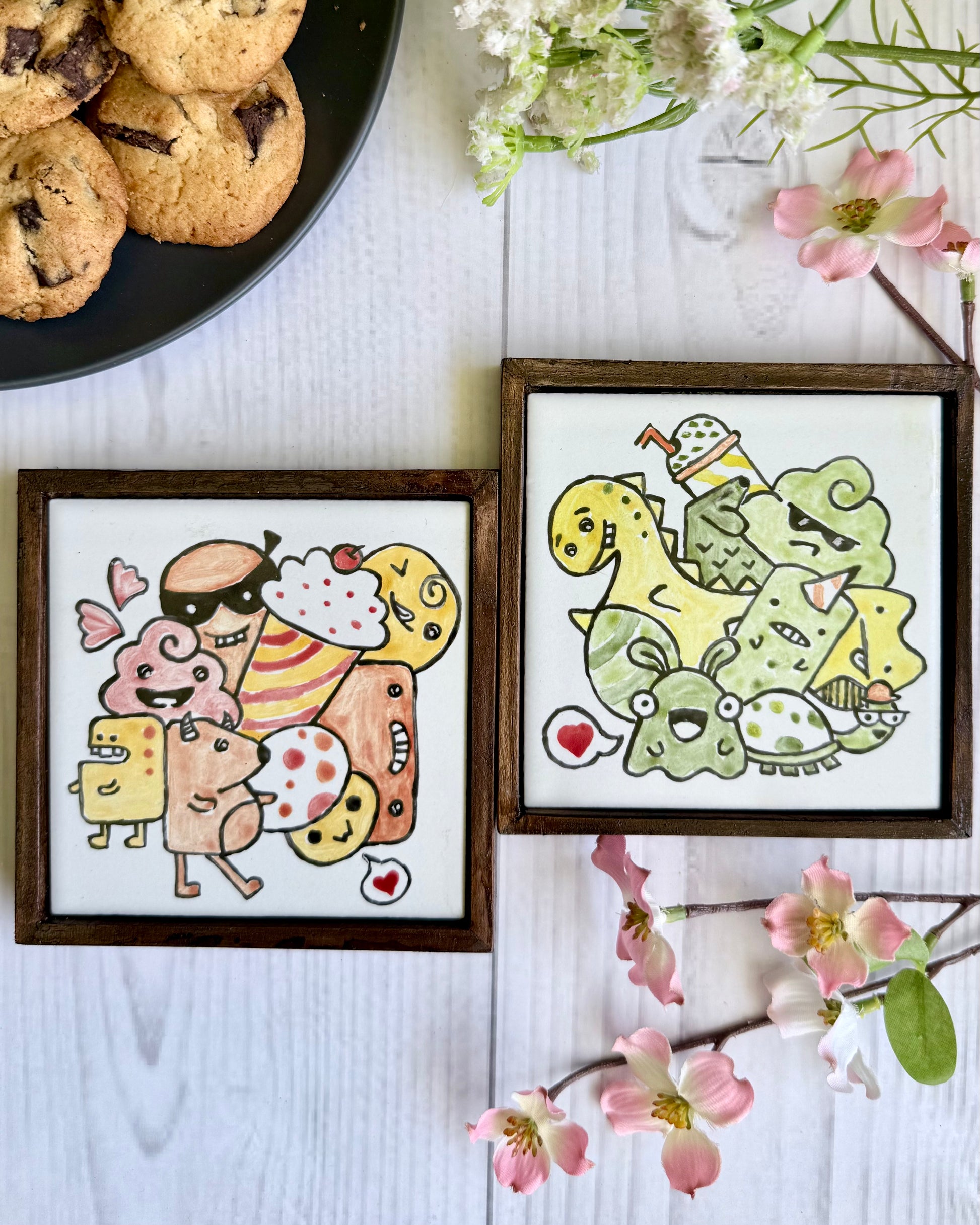 These whimsy-style, hand-painted ceramic coasters feature an adorable cartoon cluster artwork, framed in warm teak wood. Available in multiple colours and can be bought individually or as a set—perfect for adding charm and smiles to everyday moments.
