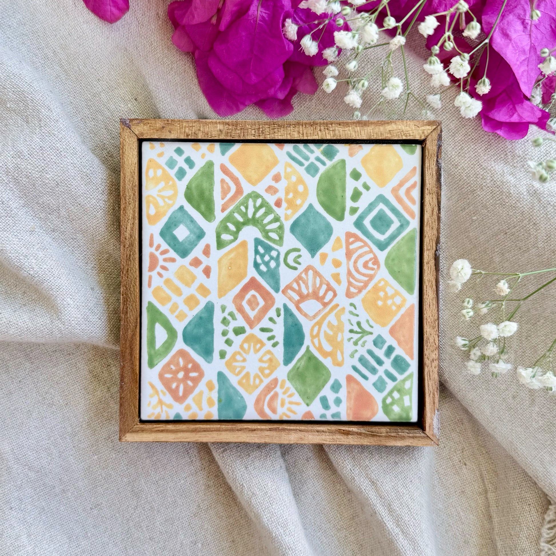 A hand-painted ceramic coaster featuring tribal-inspired motifs, thoughtfully framed in warm teak wood to bring depth, culture, and character to your everyday table.