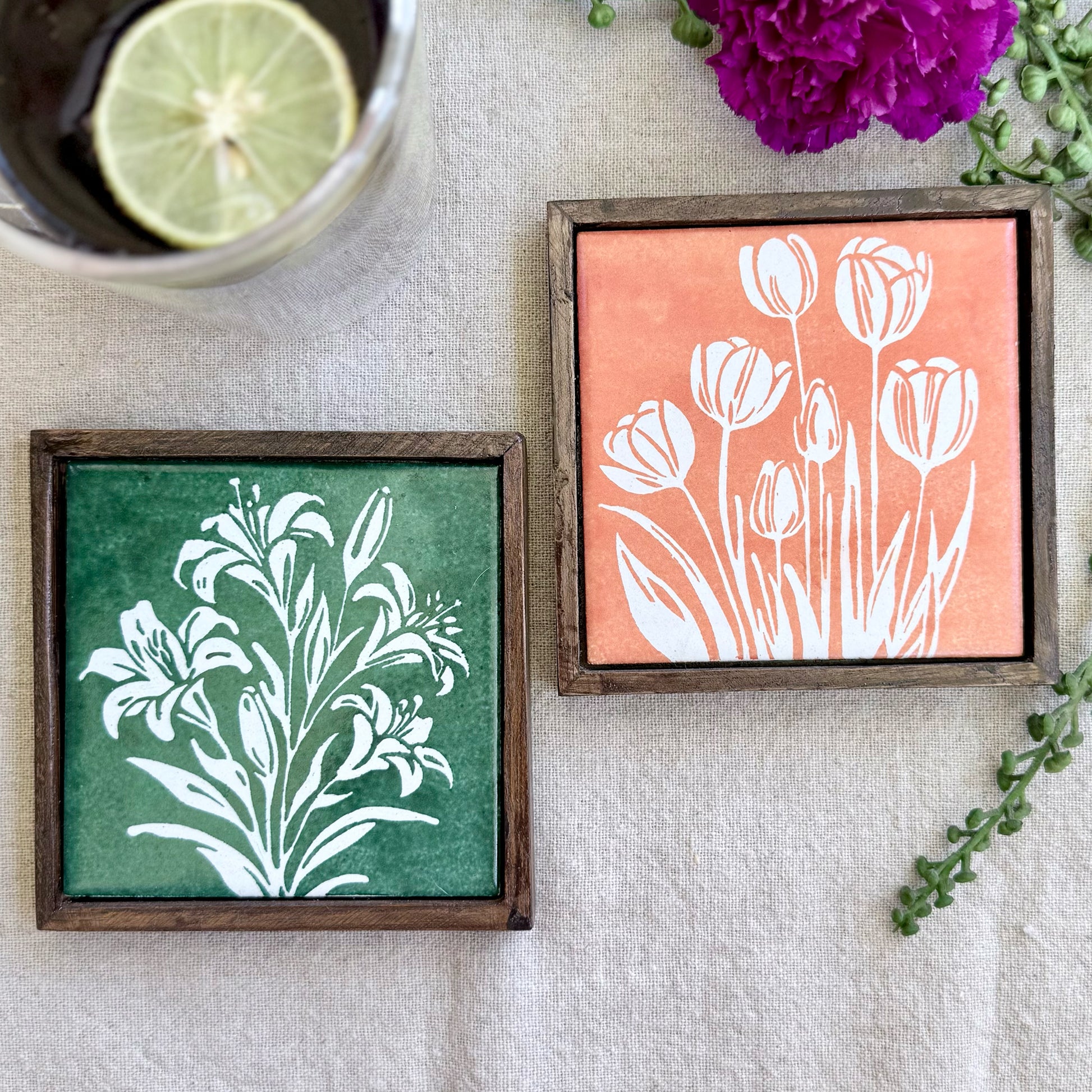 These bright and cheerful blooms ceramic coasters are hand-painted with happy floral artwork and finished in a warm teak wood frame. Available in a range of colours and can be bought individually or as a set—perfect for adding a little floral joy to your table.